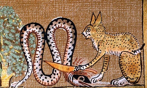 The three primary parts of the womb make up the archetypes that Mott believed occurred widely in myth: the fetus, the placenta, and the umbilical cord that connects them. Mott calls the placenta “an instrument of inheritance [which] transmits a deep organic knowledge stored in the blood.” In mythology, it takes many forms such as the twin, the tree, the cauldron/grail, the foe (poisoner, parasite), and the nurturer/teacher. The umbilical cord, through which blood is transmitted back and forth between the fetus and placenta, often appears as the serpent (especially twined, as the cord is made up of two veins and an artery), the bough, or the dragon. In Western myth, dragons are perceived as greedy, deadly, and malevolent, while in the East they are seen as benevolent guardians—both reflect qualities of the cord. It transmits the building blocks of life from the placenta, removes waste from the fetus, but also becomes less efficient as the fetus grows, eventually becoming the mortal threat that must be slayed to finalize the birthing process.